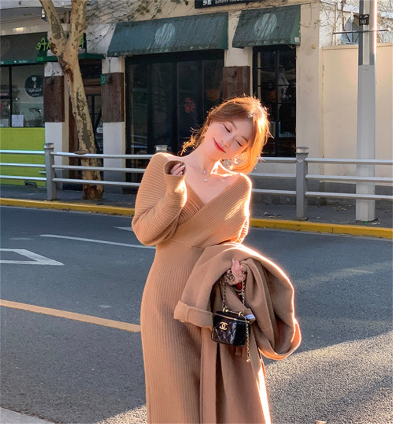 Robe slim fit pour femmes avec jupe près des hanches et col en V, offrant un look chic et moderne.