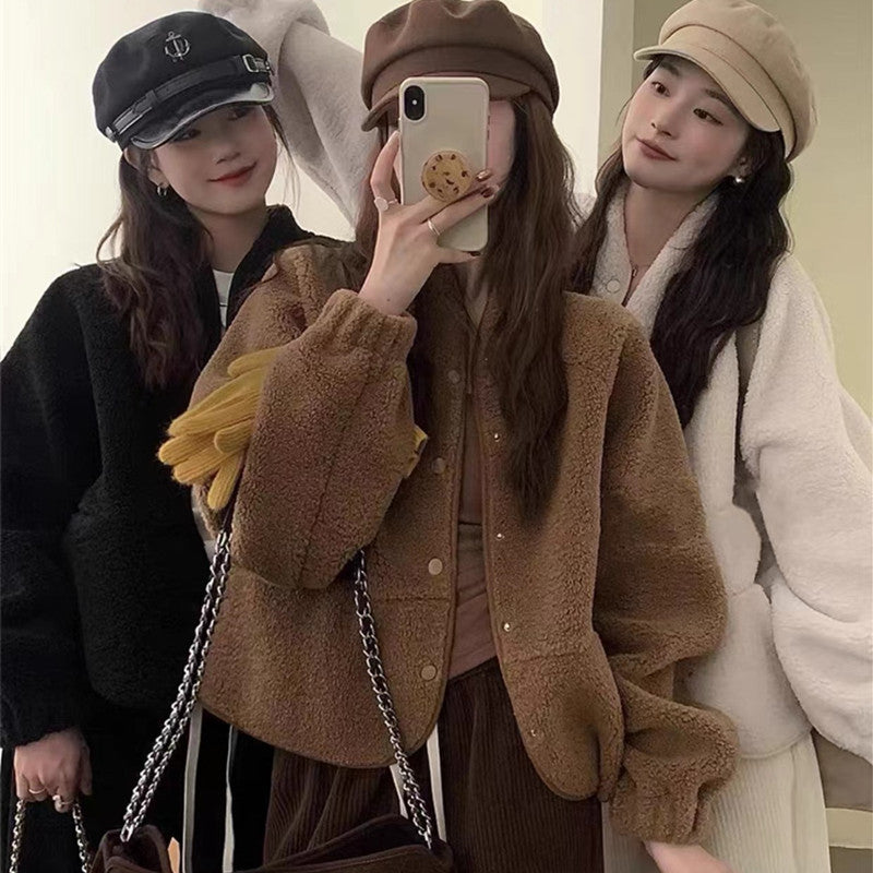 Cette veste courte en laine d’agneau offre une chaleur optimale grâce à son tissu épais. Coupe ample, douce au toucher, idéale pour l’hiver.